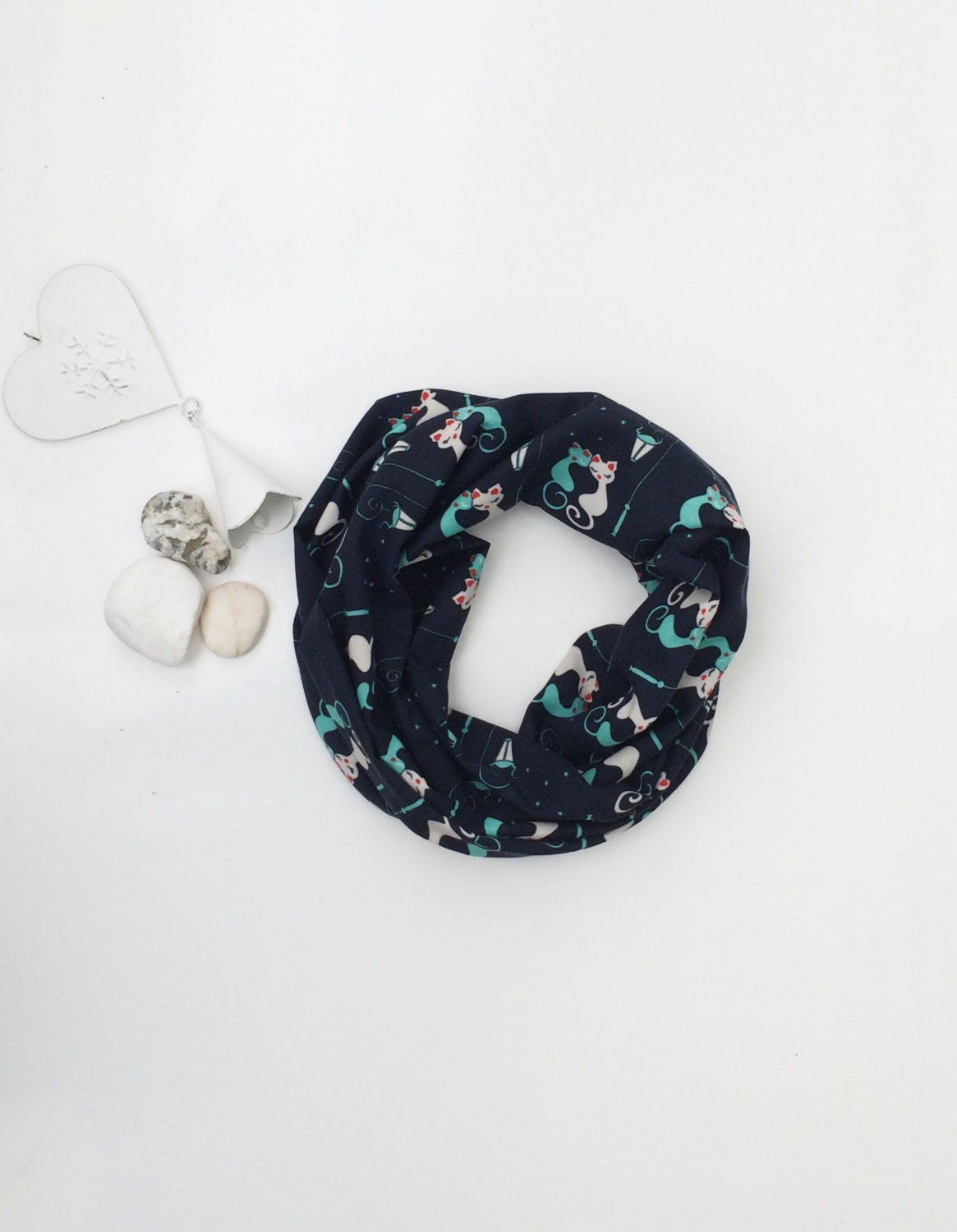 Lovely Cats Printed Dark Blue Circle Infinity Scarf Soft Cotton Lightweight Fashion Scarves, Gift Ideas for Her