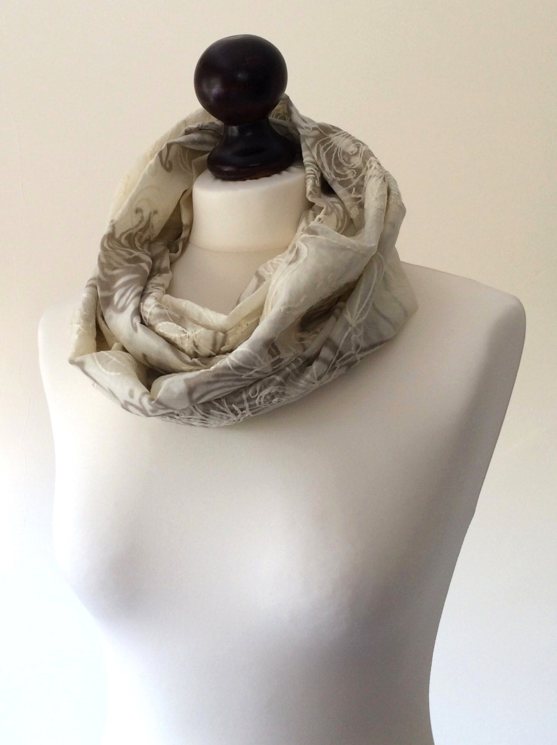 Cream Neutral Embroidered Fabric Infinity Loop Circle Scarf, Soft Cotton Loop Scarf, Women, Fashion Accessory, Gift Ideas for Her