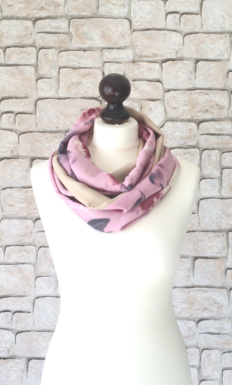 Pink Floral Circle Scarf, Two Sided Infinity Scarf Beige and Pink Flowers Circle Scarf Women Accessories Loop, Gift Ideas for Her