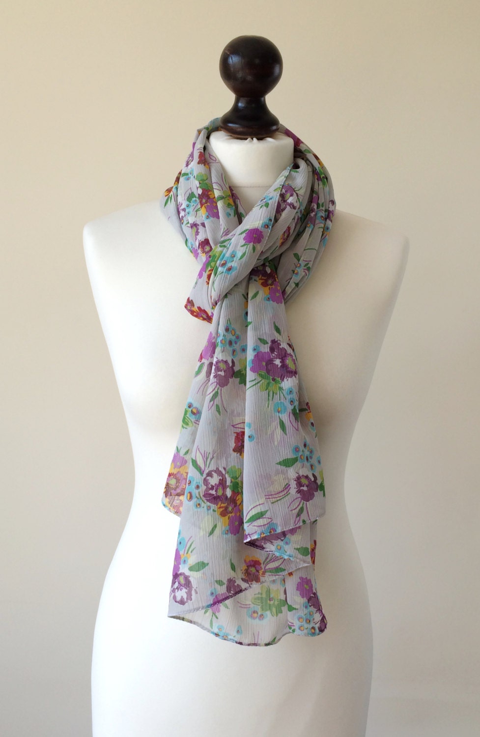 Spring Scarf, Gray FloralScarf, Summer Scarf, Mother's Day Gift, Silky Chiffon Rectangle Scarf, Oversize Scarf, Designscope Fast Delivery