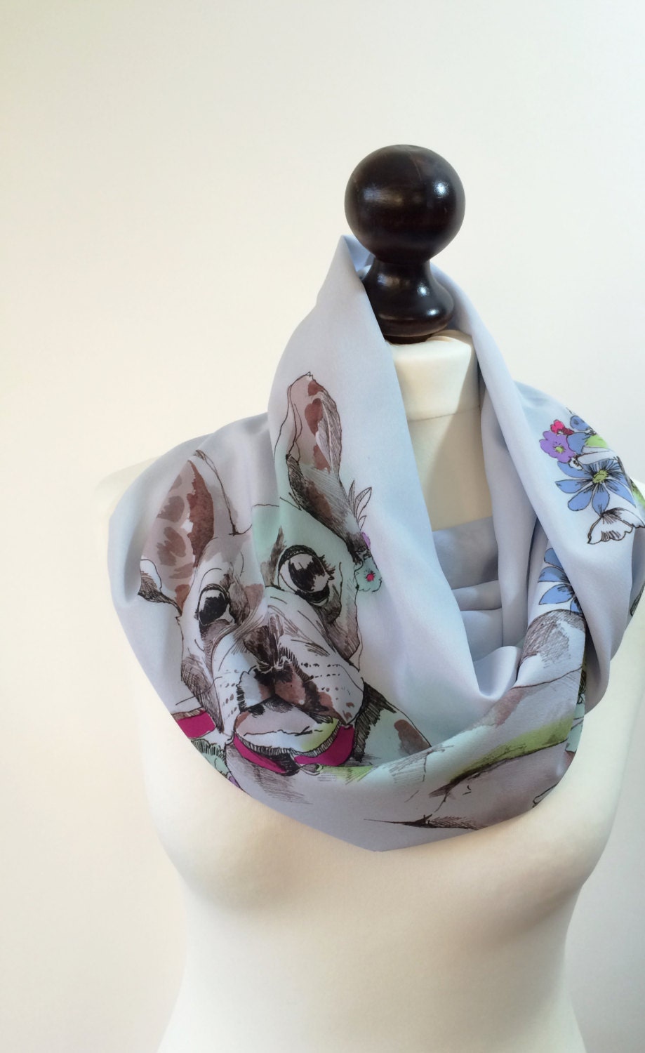 Dog Scarf Printed French Bulldog Patterned Summer Infinity Scarf Gray Colorful Chiffon Circle Scarf Women Accessories, Fast Delivery