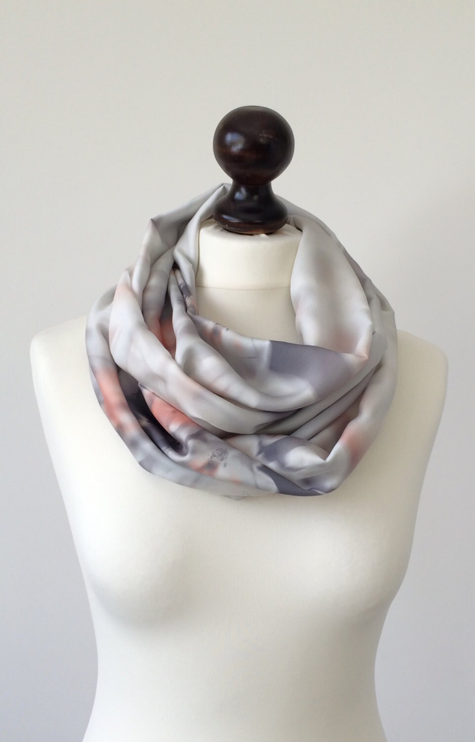 Peach Gray Watercolor Patterned Satin Cotton Blend Infinity Loop Circle Scarf, Floaty Fabric, Women, Lightweight Scarf, Fast Delivery