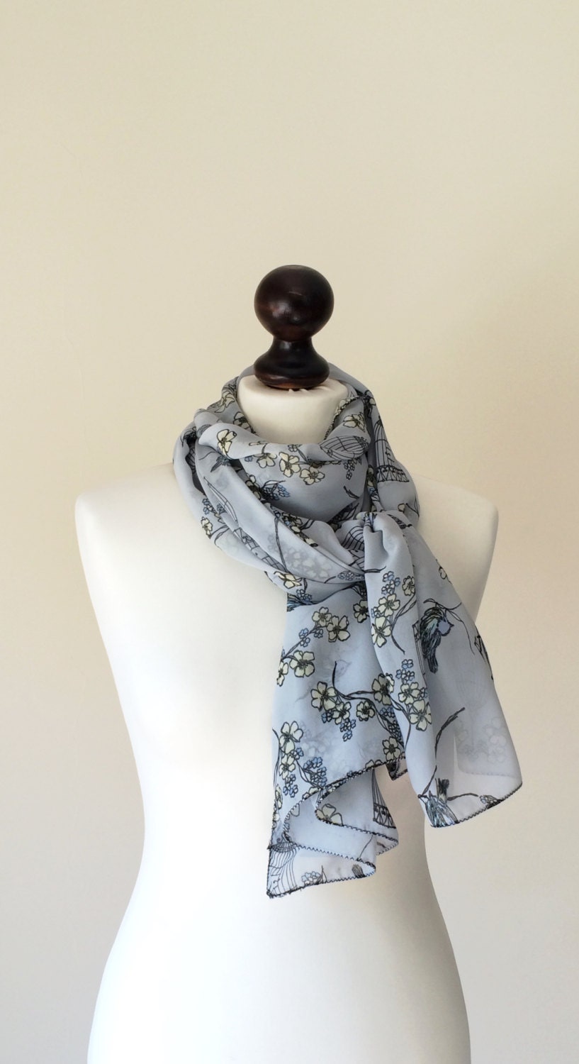 Spring Scarf, Gray Scarf, Bird Scarf, Bird Cage Scarf, Floral Scarf, Silky Chiffon Rectangle Scarf, Oversize Scarf, Designscope